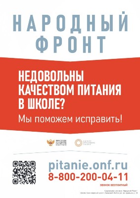 Общероссийское общественное движение «Народный фронт «За Россию» с 2020 года осуществляет мониторинг и прием обращений граждан по вопросам исполнения поручения Президента Российской Федерации от 24 января 2020 г. № Пр-113 (пункт 5) «О бесплатном питании в начальных классах» и соблюдения законодательства в сфере организации питания обучающихся во взаимодействии с Минпросвещения России.