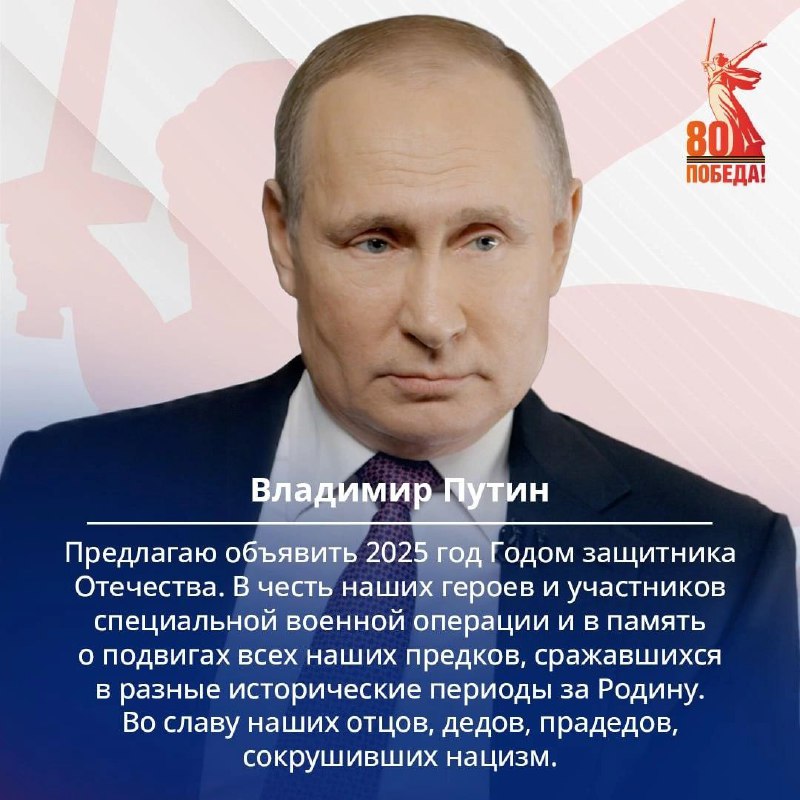 2025-й – Год защитника Отечества. С таким предложением выступил президент России Владимир Путин на Госсовете по вопросам поддержки семей. Выбрать тематику нового года президент предложил в честь участников спецоперации и в память о подвигах предков. Тематика года отражает приоритеты современной России – патриотизм, преемственность поколений и уважение к защитникам Родины во все времена.